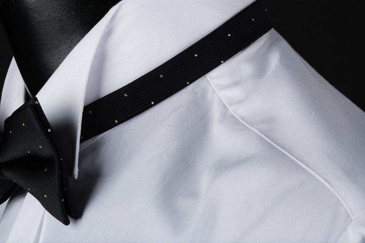 Pánský společenský motýlek v černé barevné variaci se stříbrnými tečkami.Součástí dodávky je i kapesníček.