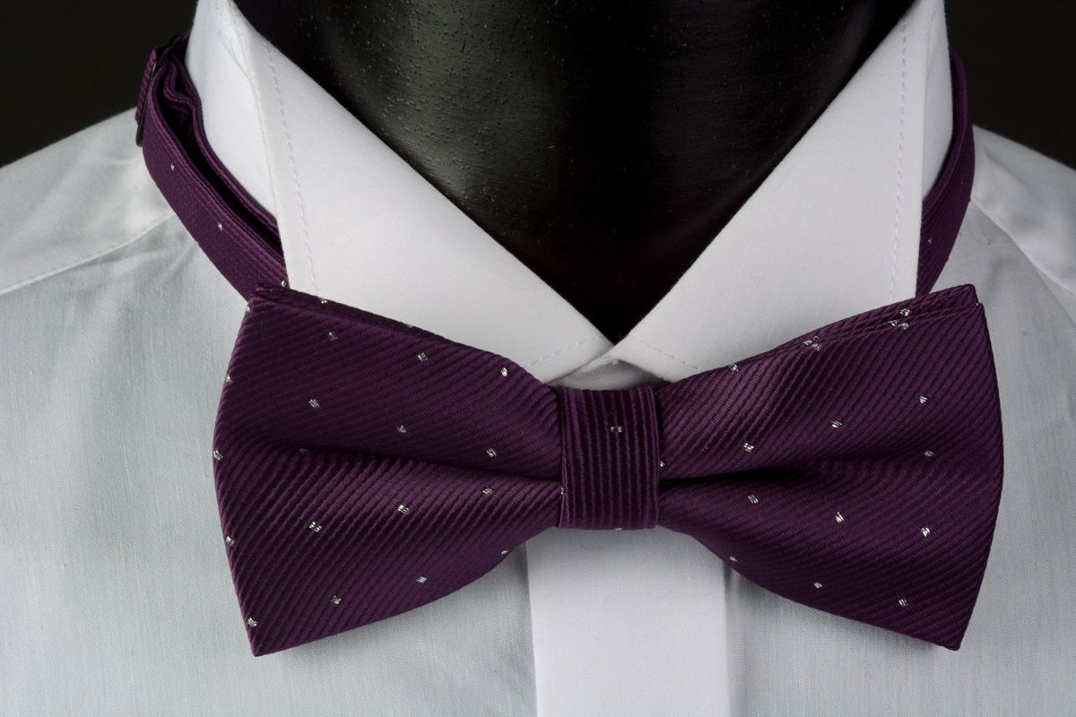 Pánský nevázací společenský motýlek v jednobarevné purpurovém provedení se stříbrnýma tečkama.Součástí dodávky je i kapesníček