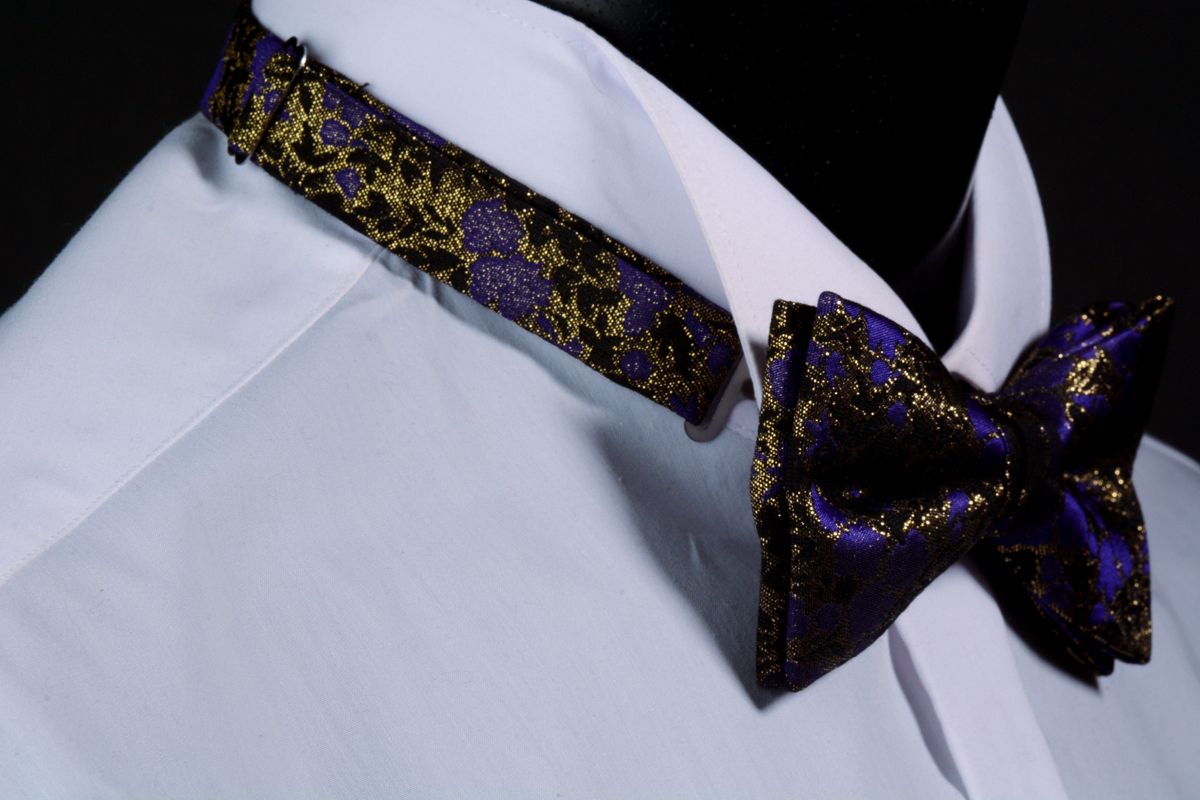 Pánský luxusní společenský zapínací motýlek v základní černé a fialové barvě se zlatým ormamentem.